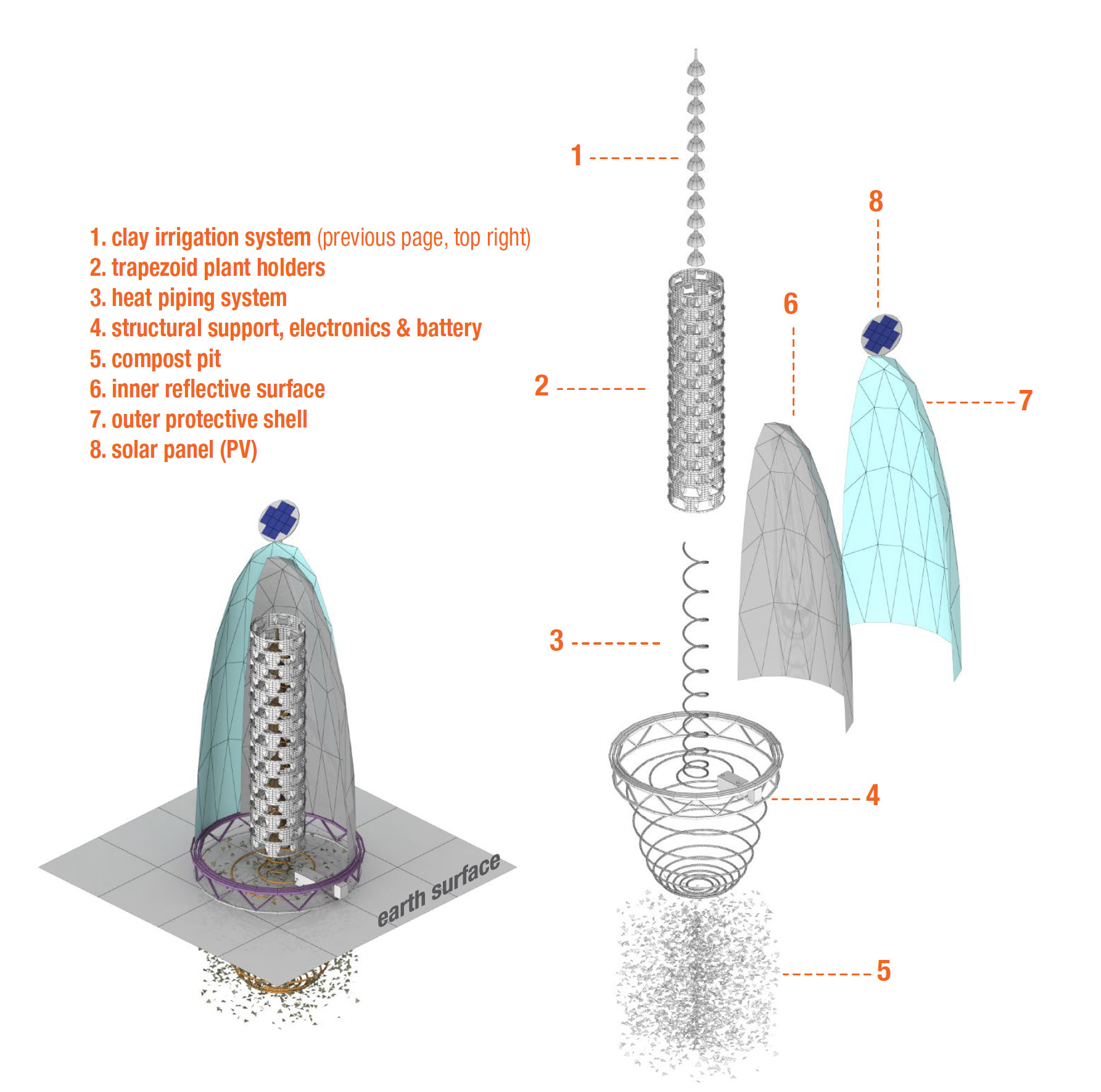 The Food Resource Integrated Data Sharing pod is an evolution from Osian’s tower. FRIDS will be a sustainable, open source food production solution. A variety of reusable materials may be used to build the pods. In order to ensure biodiversity, collaborations can be forged with non profit heirloom seed distributors like KokoPelli.
