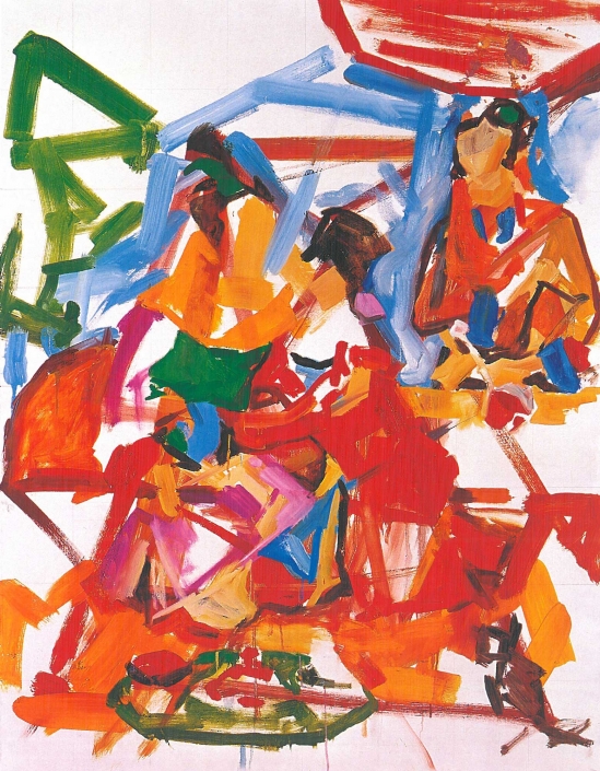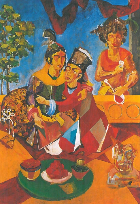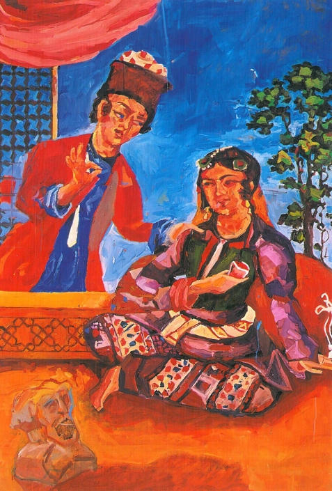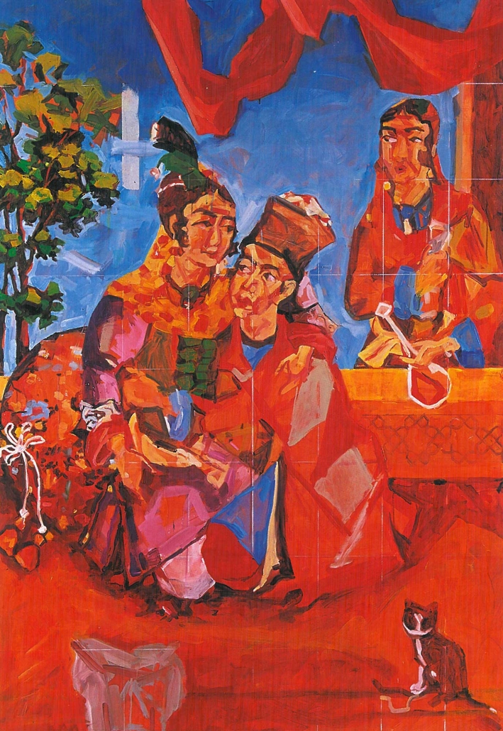 The works of Amir Hossein Akhavan are more than anything a reverence to painting. Not that the subject or the story the finished work will tell are unimportant to the painter, or that it does not matter whether the paintings are criticized in one place and praised in another, but aside from these and other subjects that painters generally communicate to viewers through their art, what constitutes the essence of Akhavan’s works and their beginning and finishing points, is painting for painting’s sake. The works, both individually and as a collection, convince the viewer that the painter is concerned primarily with colour, brushstroke, composition, and all of the elements that make a painting . Elements such as style, subject, relationship to reality, added to painting, as a specific form of artistic expression, are disregarded at the initial stage. The results are works that capture the essence of painting and communicate with the viewer with, and only with , visual language. Now, what that language says is a story of its own: the timelessness of patterns, the authenticity of colours, the importance of identities, and finally, the beauty of that which, as the artworks reveal , we have always prized and treasured : love and affection and the ability to express it.