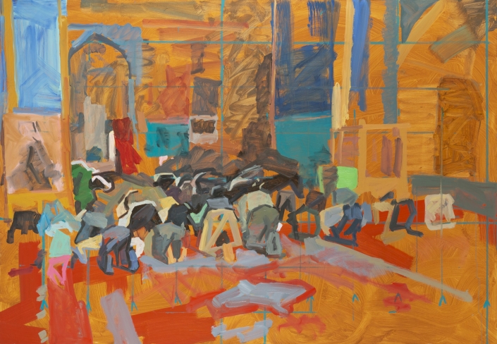 Trusting my aesthetic to follow its own path, I respond in my studio. My intentions are to draw, to use color, and to paint my Namâz experience. This process culminates into a reduced form – bars.