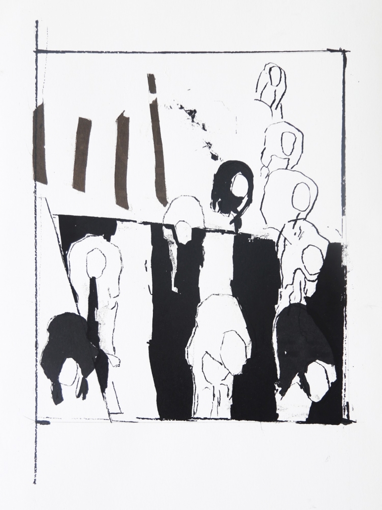 A large work designed to bring the viewer into the painting, portraying the destruction that leads to refugee crisis.